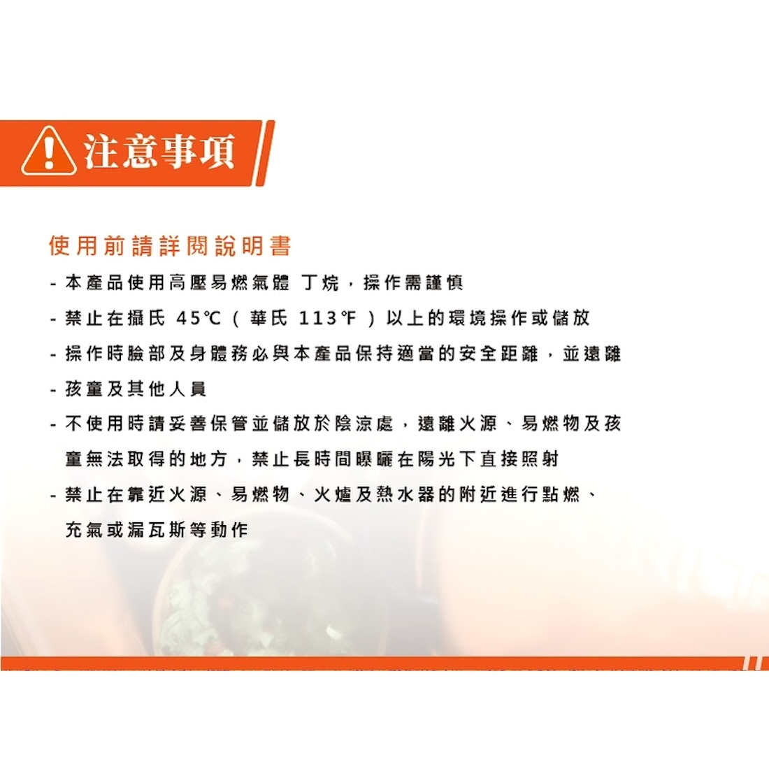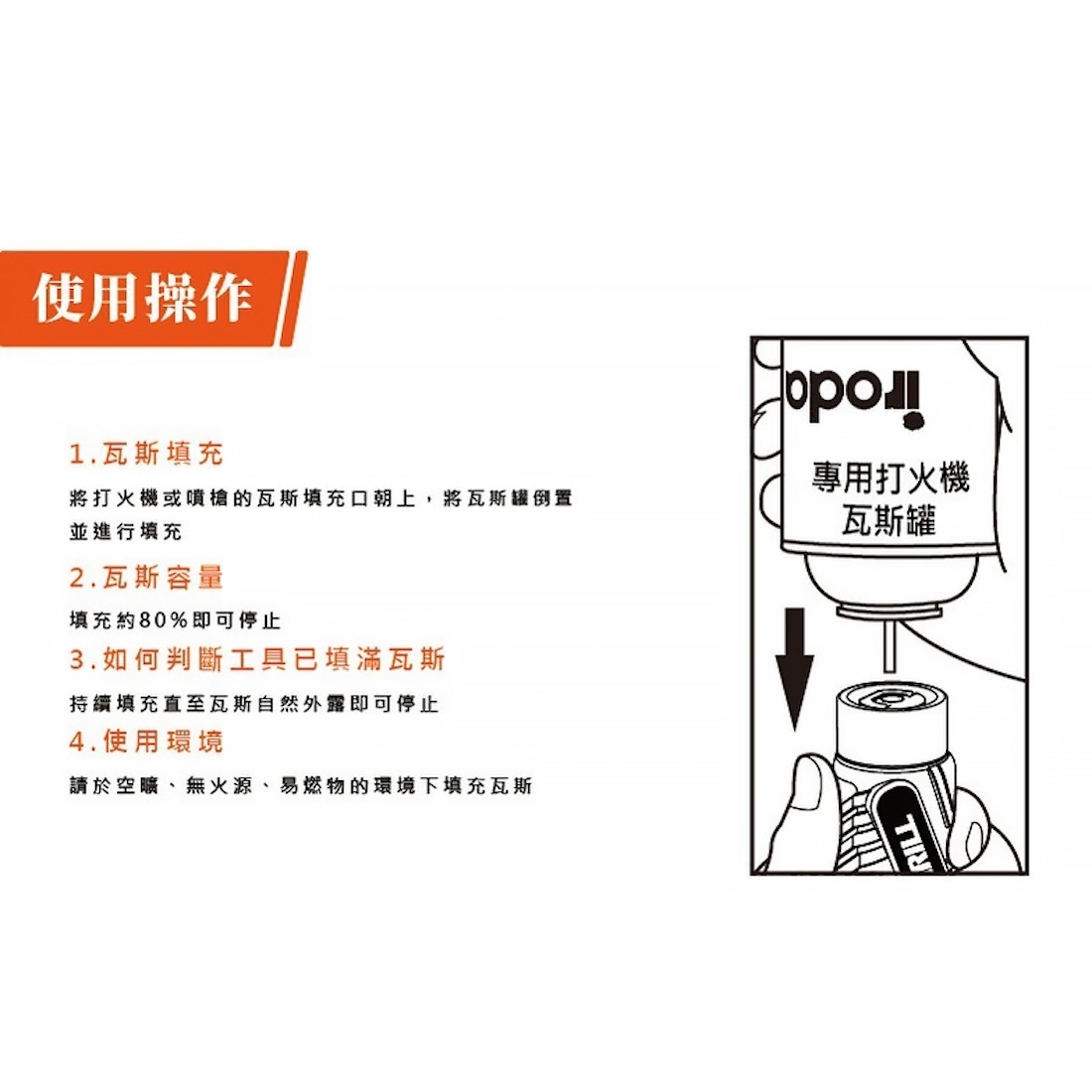 • 請於空曠、無火源、易燃物的環境下填充瓦斯