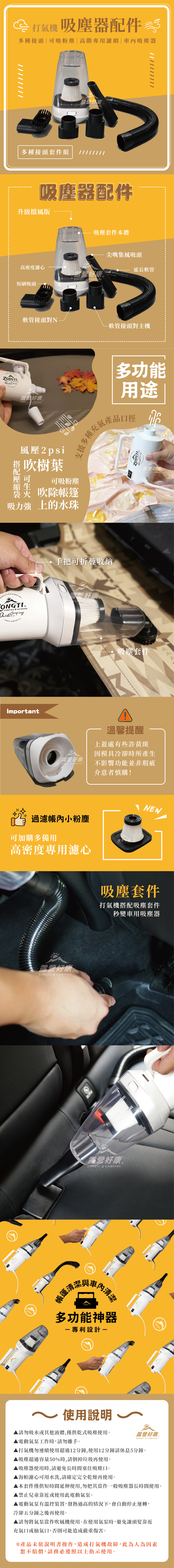 💡搭配吸塵器套件:吸力強,可有效吸附帳篷內頭髮、樹葉、餅乾屑