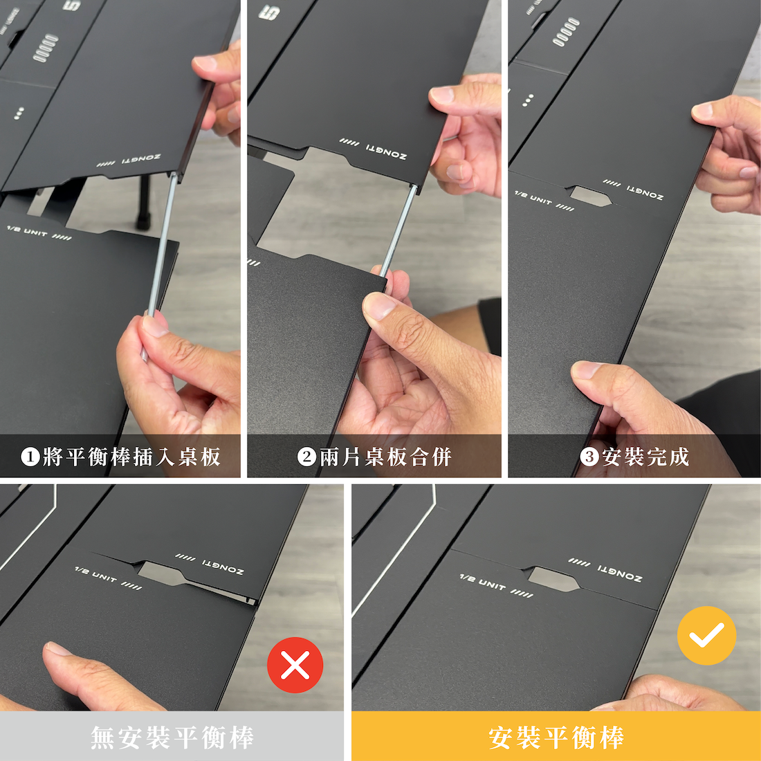 ✔ 獨家平衡棒設計,讓側邊滑軌桌板,平穩不下陷