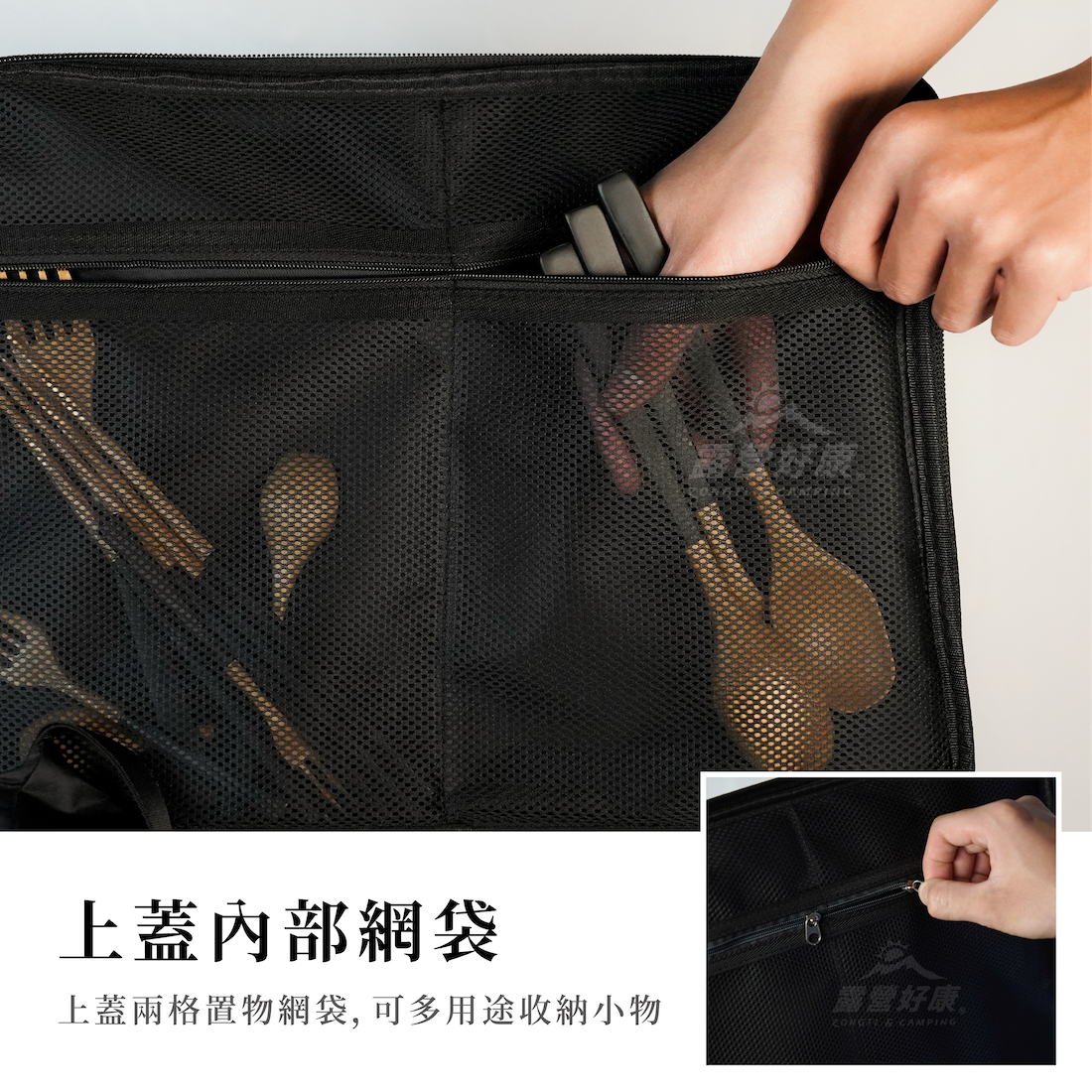 ✔上蓋兩格置物網袋,可多用途收納小物
