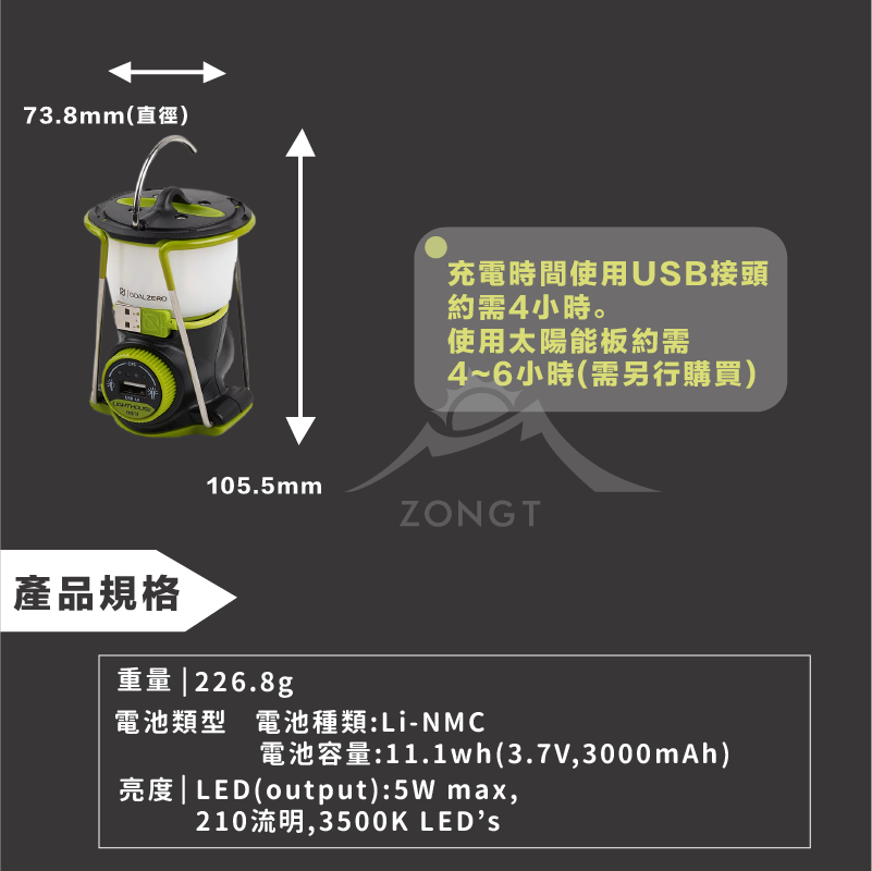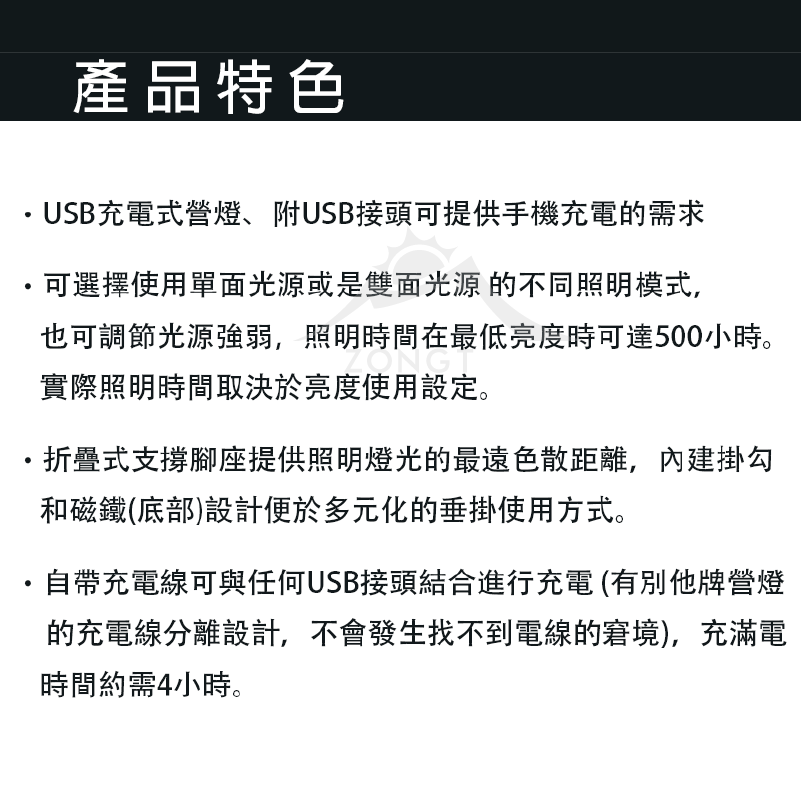 USB充電式營燈,附USB接頭可提供手機充電的需求。