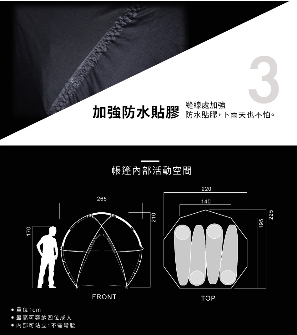 尺寸:高度210cm、地墊-230x216cm(不含外帳尺寸)