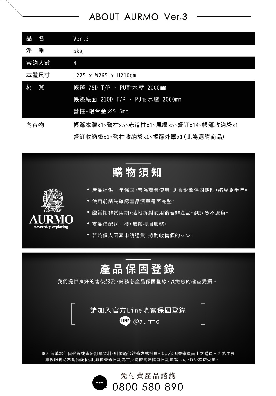 內容物:帳篷本體x1、外罩x1、營柱x5、赤道柱x1、營繩x5、營釘x10、帳篷收納袋x1、營柱收納袋x2、營釘收納袋x1