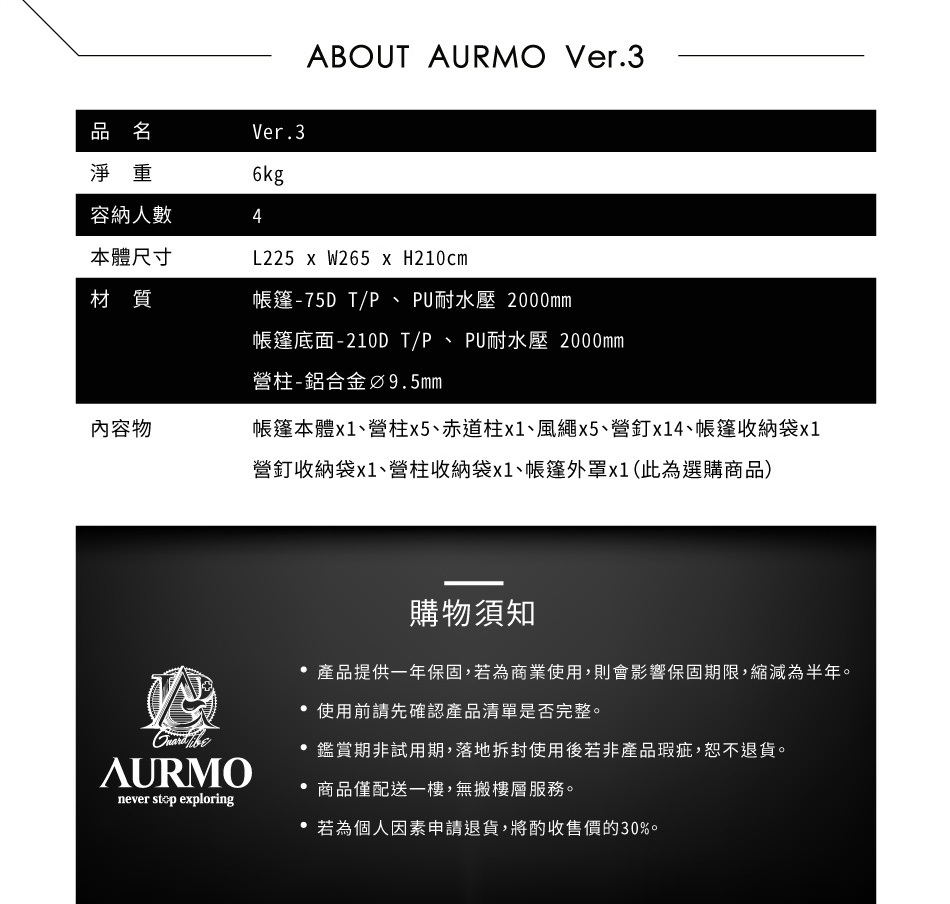 材質:帳篷-75D polyester、地墊-210D polyester・PU防水加工(耐水壓2,000mm)、營柱-Ø9.5cm鋁合金