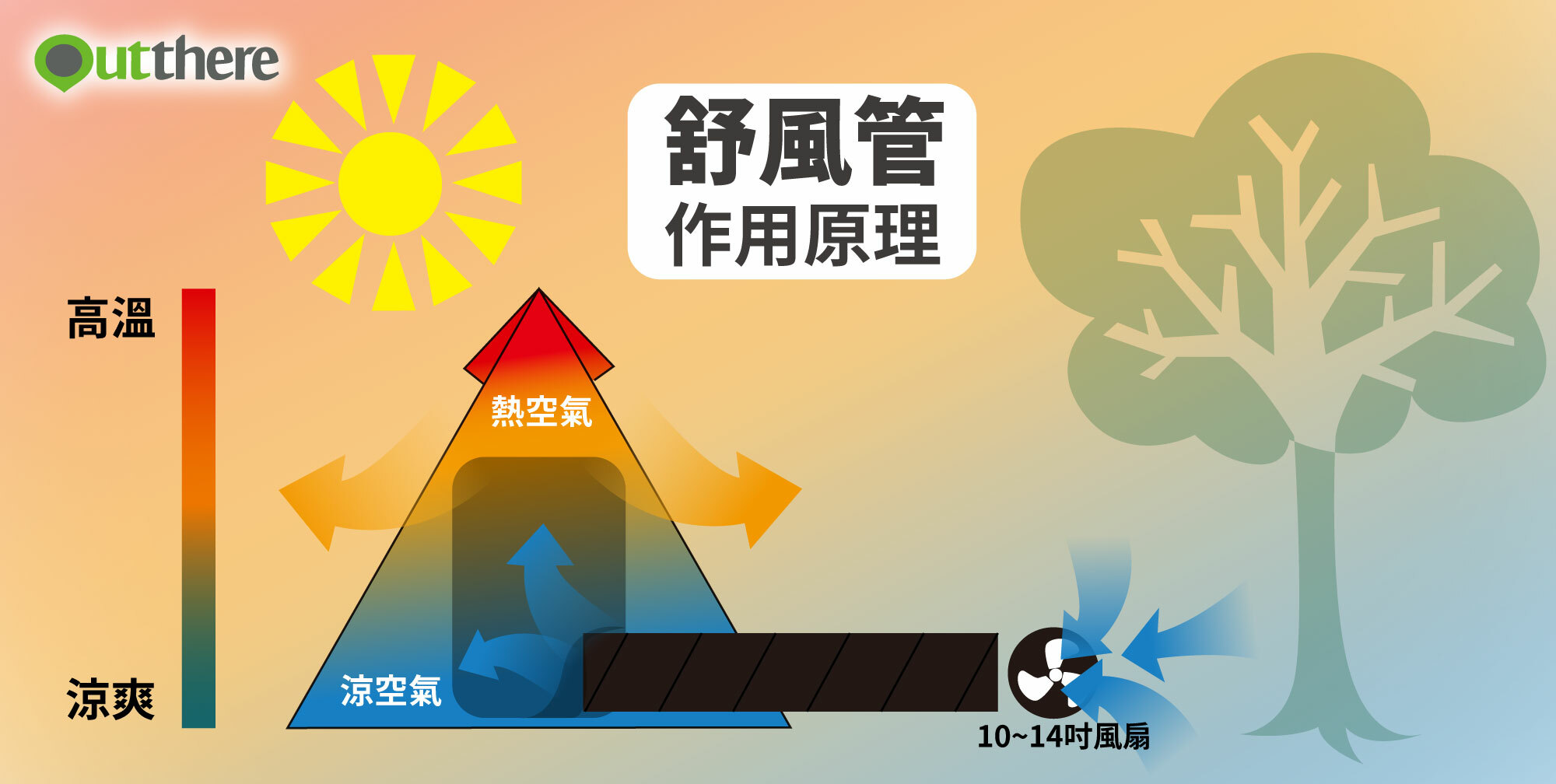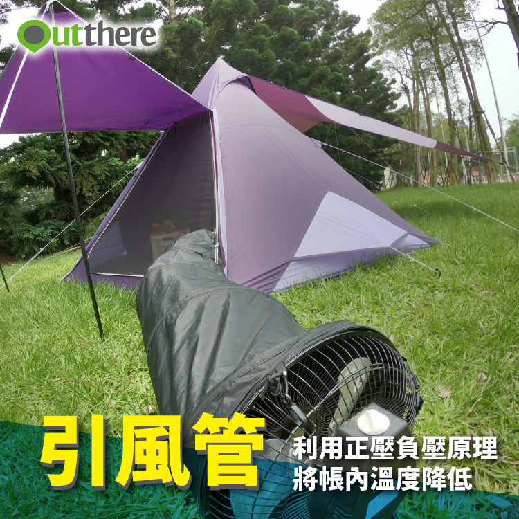 夏天露營搭帳時,利用正壓負壓原理,將電扇放在戶外,風管一端扣掛在電扇網罩上,風管另一端伸入帳內,可將較冷的風透過風管送進帳內,提高空氣流動效率,降低帳篷內部的溫度。