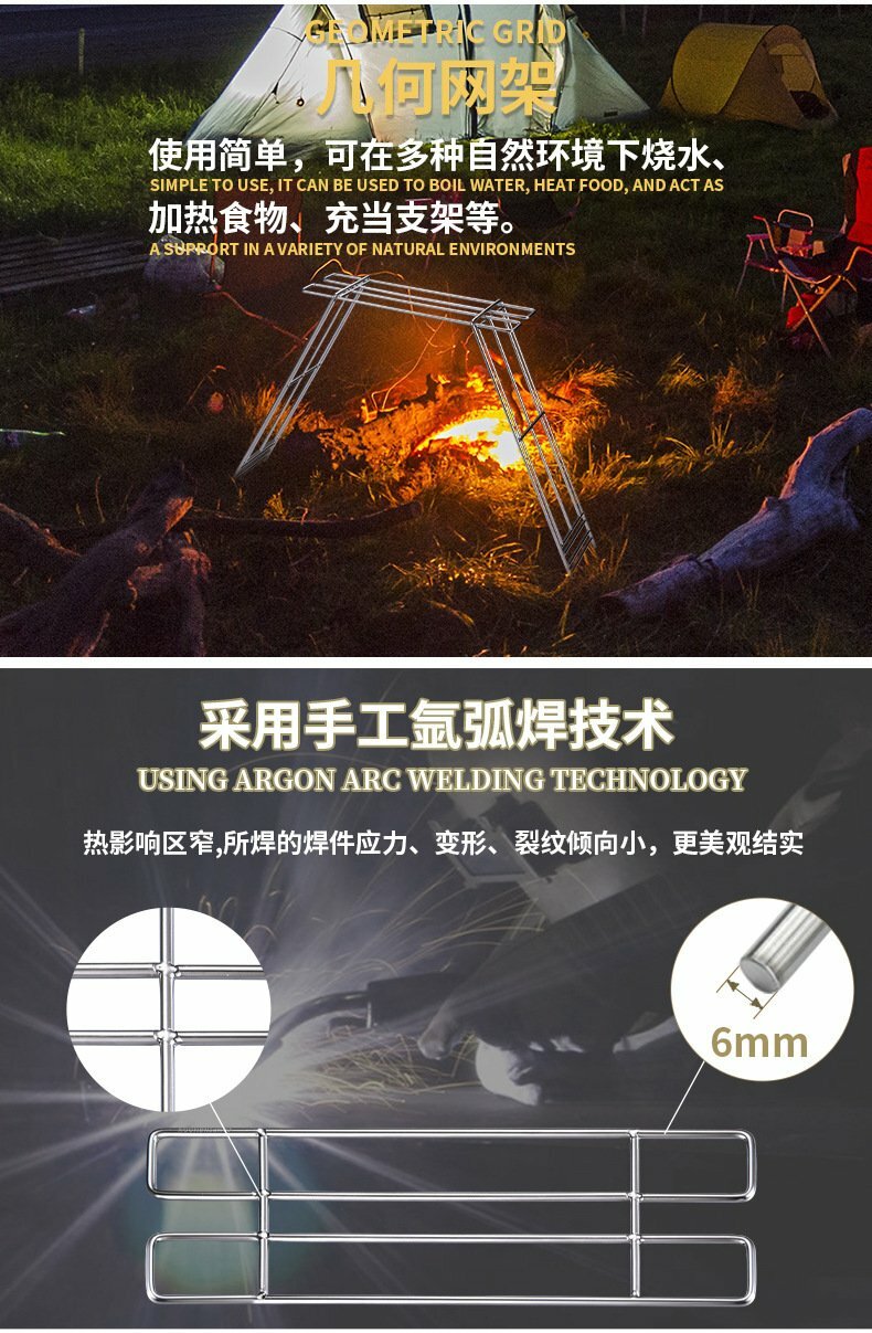 不鏽鋼輕量焚火台,適合露營野炊,使用簡單,可在多種自然環境下燒水、加熱食物、充當支架等。