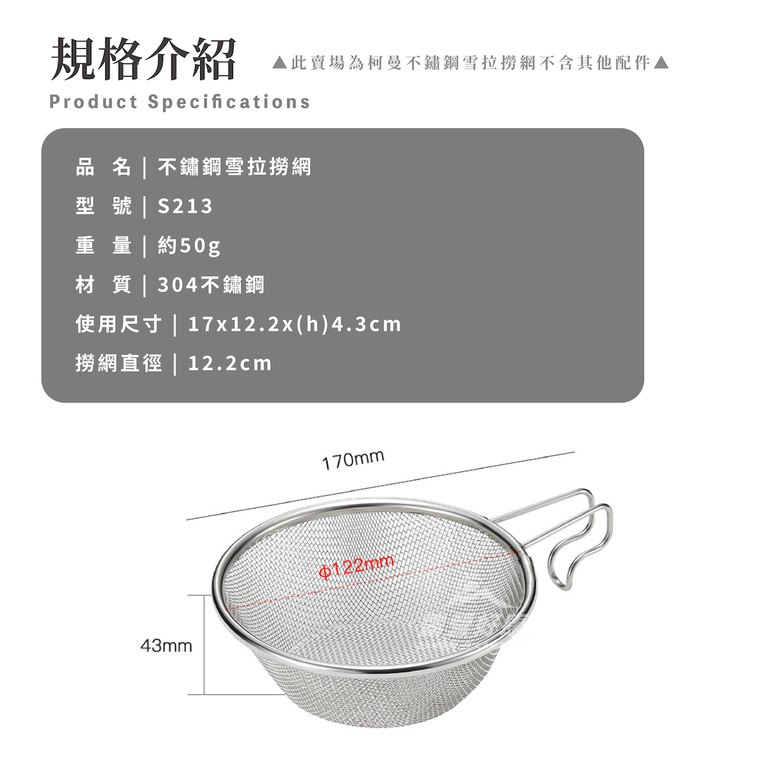 ▲注意:此賣場僅販售不鏽鋼雪拉撈網,不包含雪拉碗等其它商品▲
