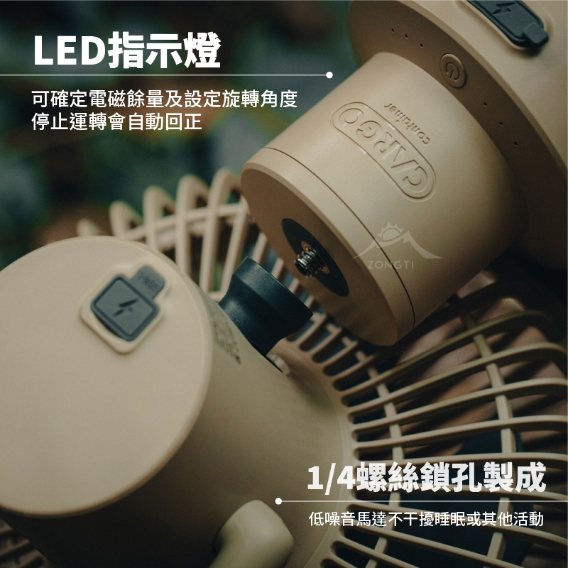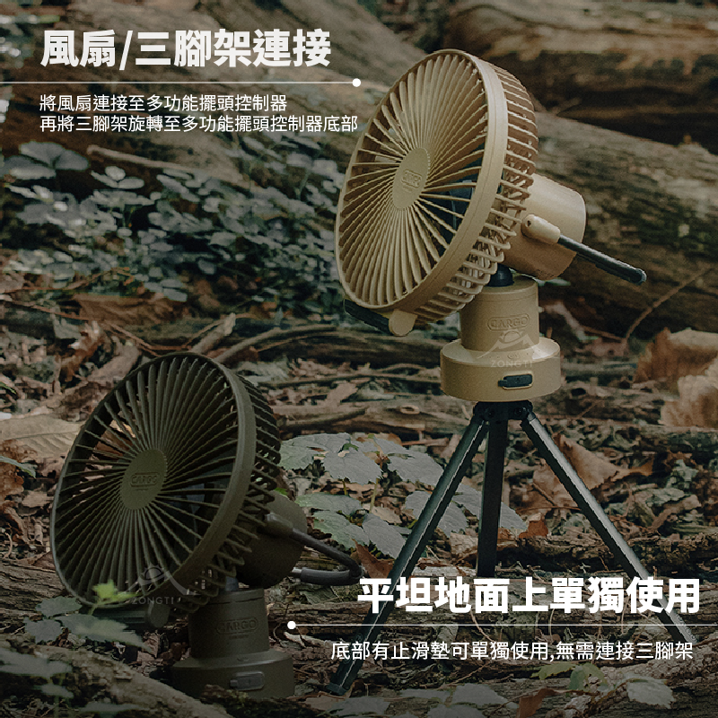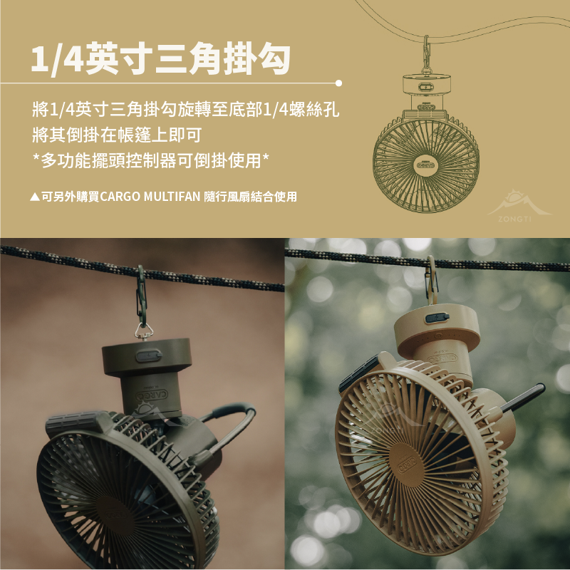 多功能擺頭控制器的底部帶有1/4螺絲孔,可以結合CARGO MULTI FAN隨行風扇專用三腳架或連接多功能擺頭控制器內附的1/4英吋三角掛勾,將其吊掛在帳篷上使用。