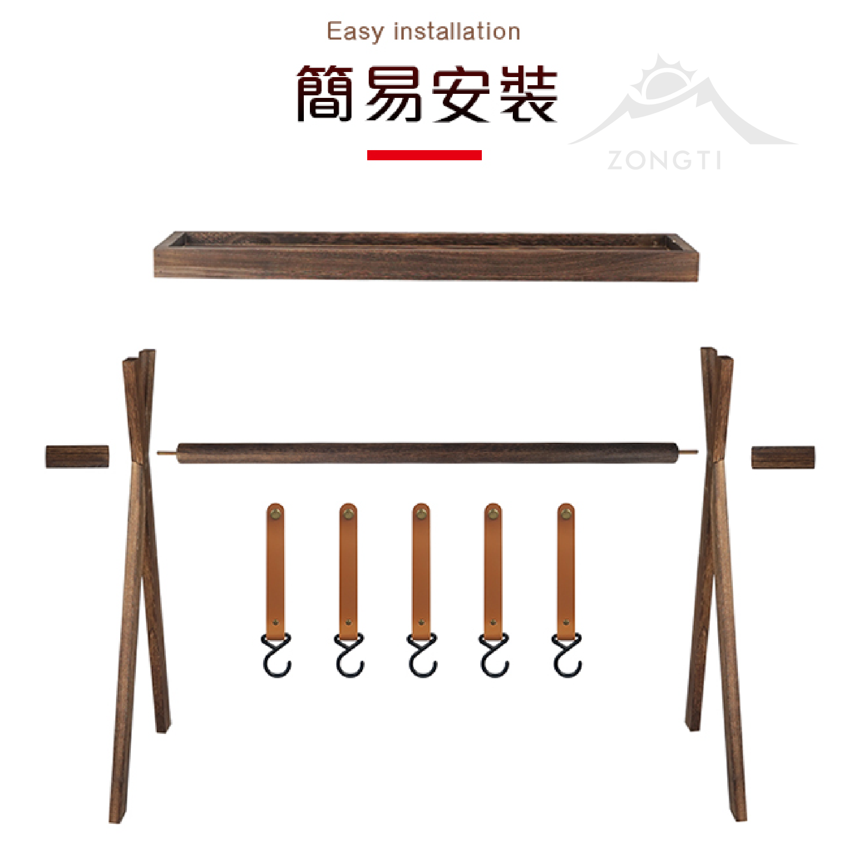 內容:桌面*1 / 支撐桿*4 / 橫桿*1 / 掛勾*5 / 邊筒*2