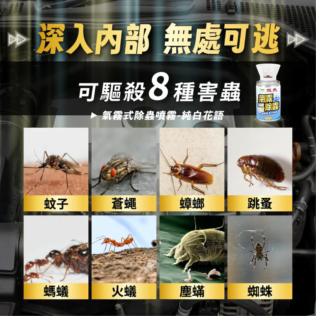 ◆ 防治8害蟲:蚊子/蒼蠅/蟑螂/跳蚤/螞蟻/火蟻/塵蟎/蜘蛛