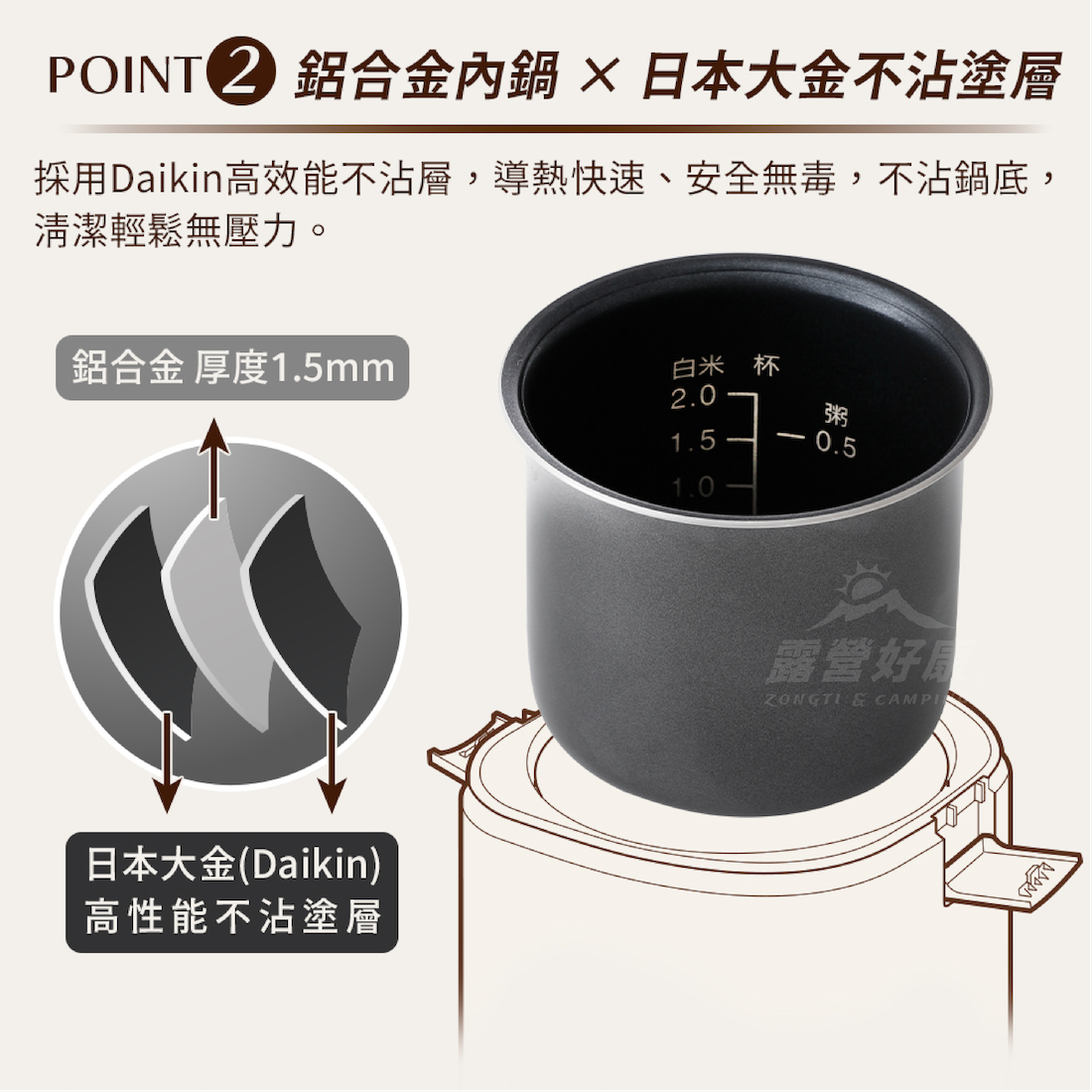 ✔鋁合金內鍋,搭配大金不沾塗層,不易沾黏,好煮又好洗