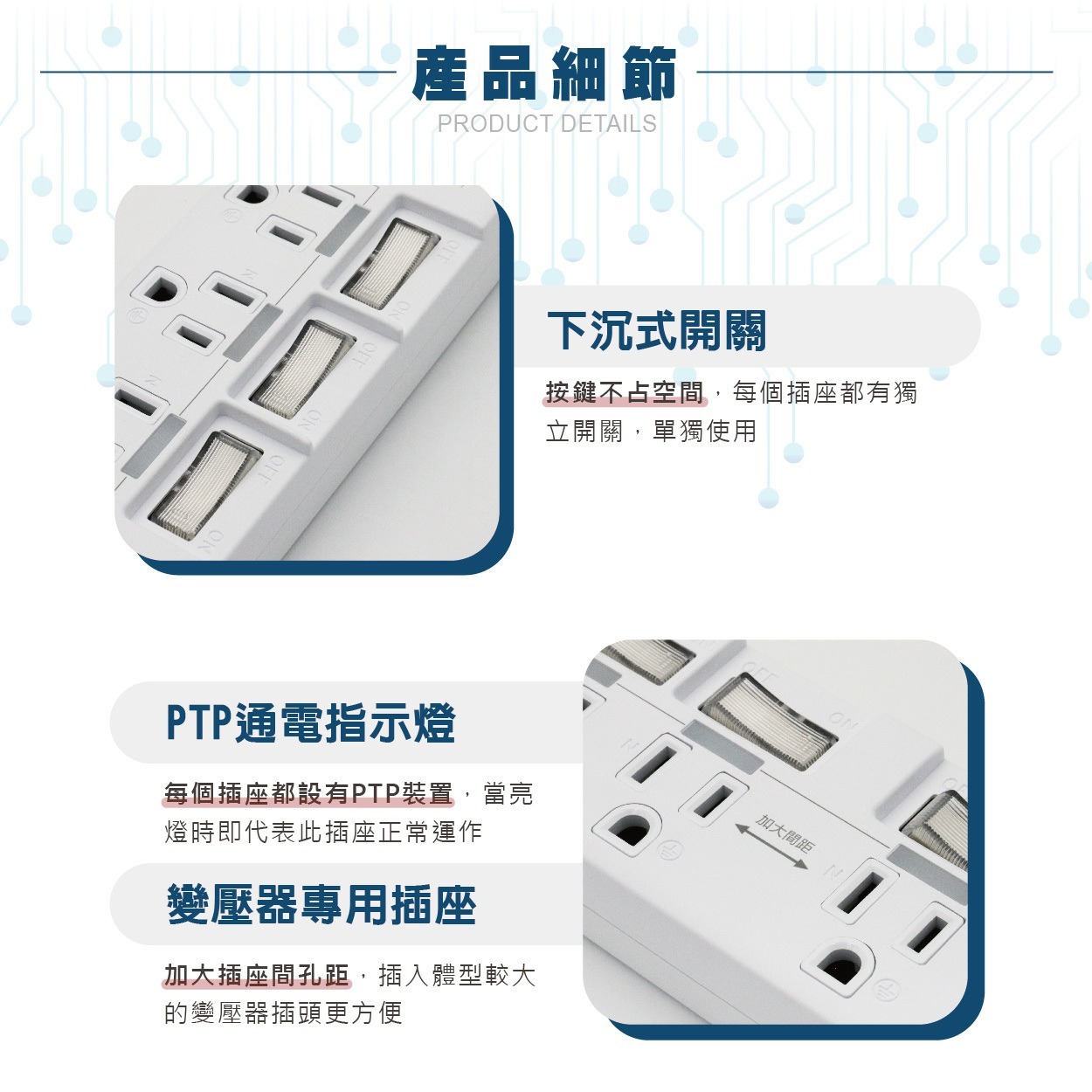 ✔按鍵下沉式設計,每個插座都有獨立開關