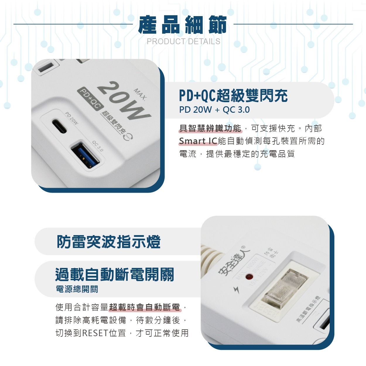 ✔電源總開關,過載自動斷電開關,合計容量超載時會自動斷電