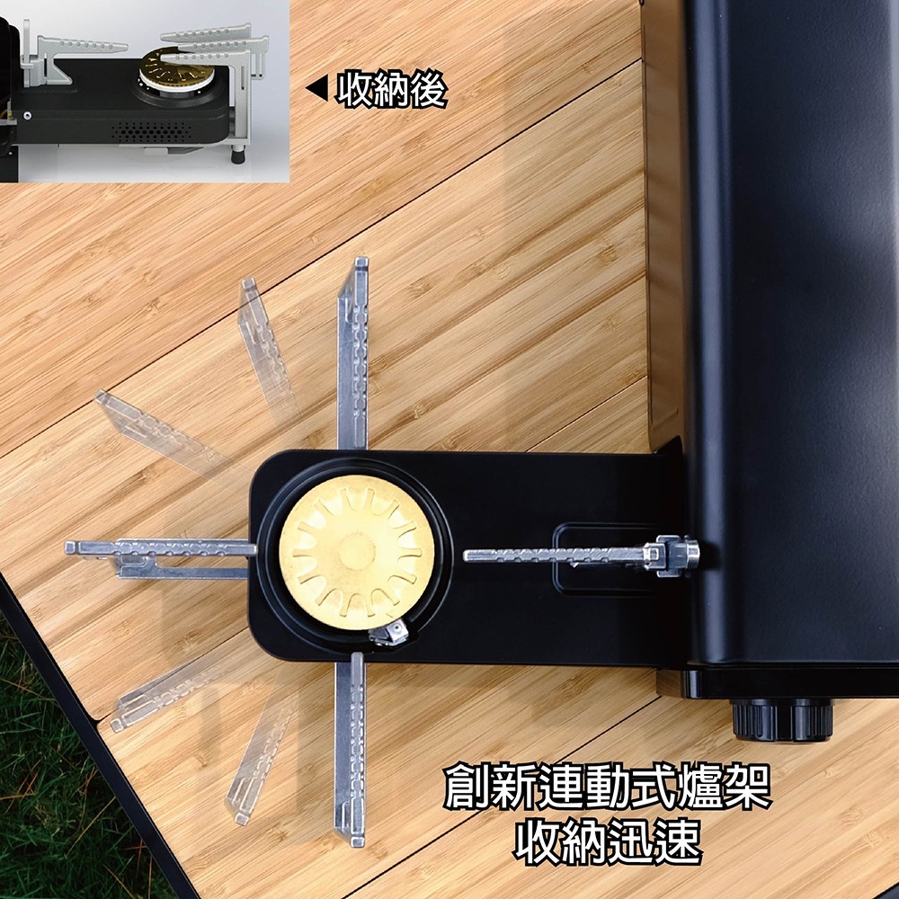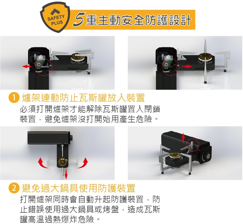 1. 爐架連動防止瓦斯罐放入裝置:必須打開爐架才能解除瓦斯罐置入閉鎖裝置,避免錯誤爐架使用方式。