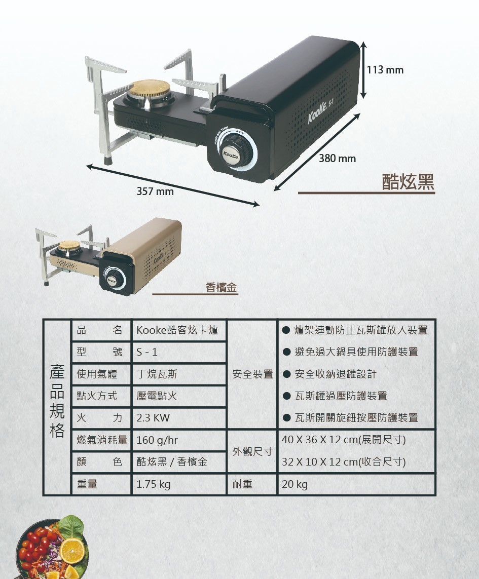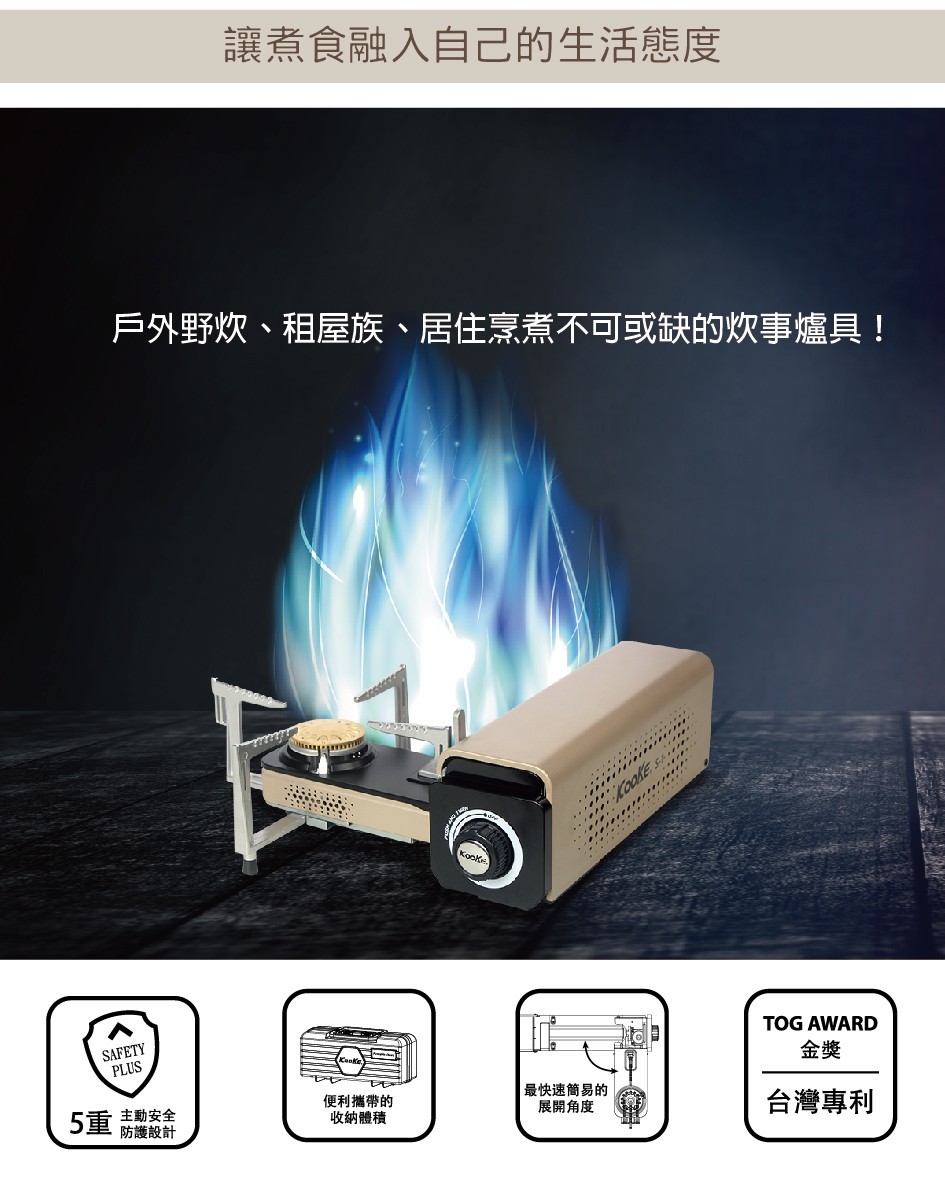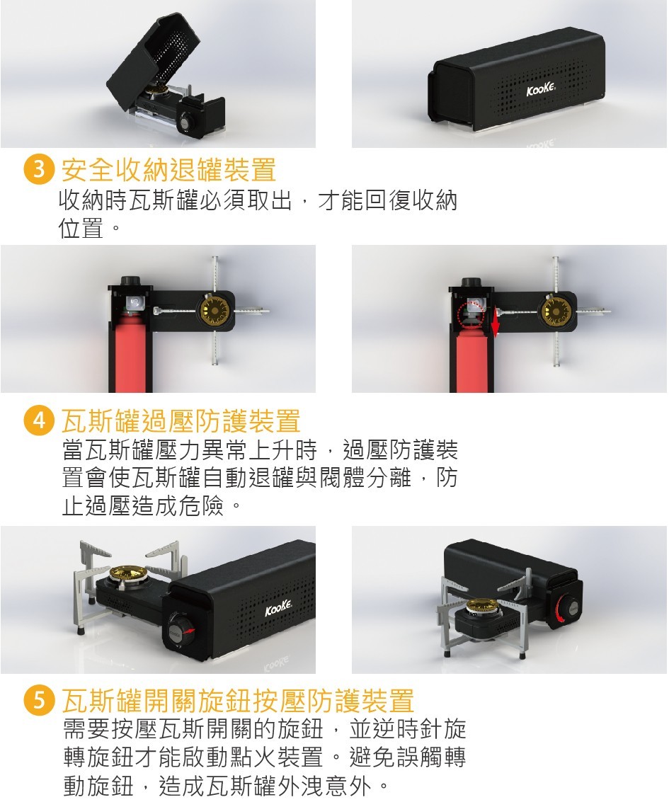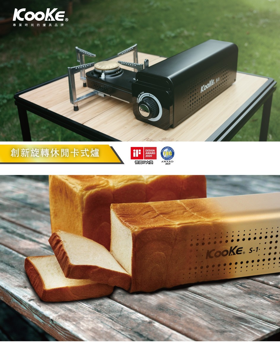 「Kooke酷客炫卡爐」創新可旋轉式的休閒卡式爐,具五重主動安全防護設計,採用整體式收合設計,專利連動裝置僅需打開爐架旋轉出爐台即可使用,體積輕巧,節省收納空間,便利攜帶,減輕裝備負擔,擺脫一般市售卡式爐體積厚重印象,機能與外型時尚兼顧的精緻戶外休閒卡式爐。