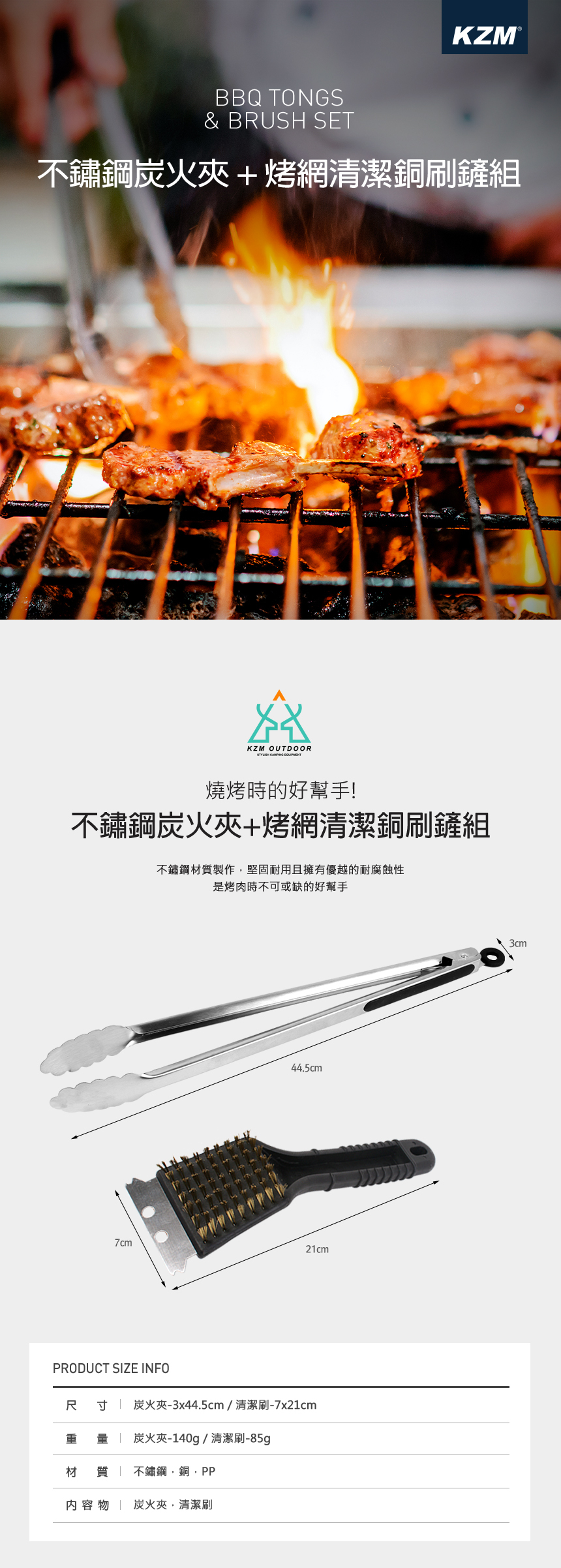 KZM 不鏽鋼炭火夾+烤網清潔銅刷鏟組