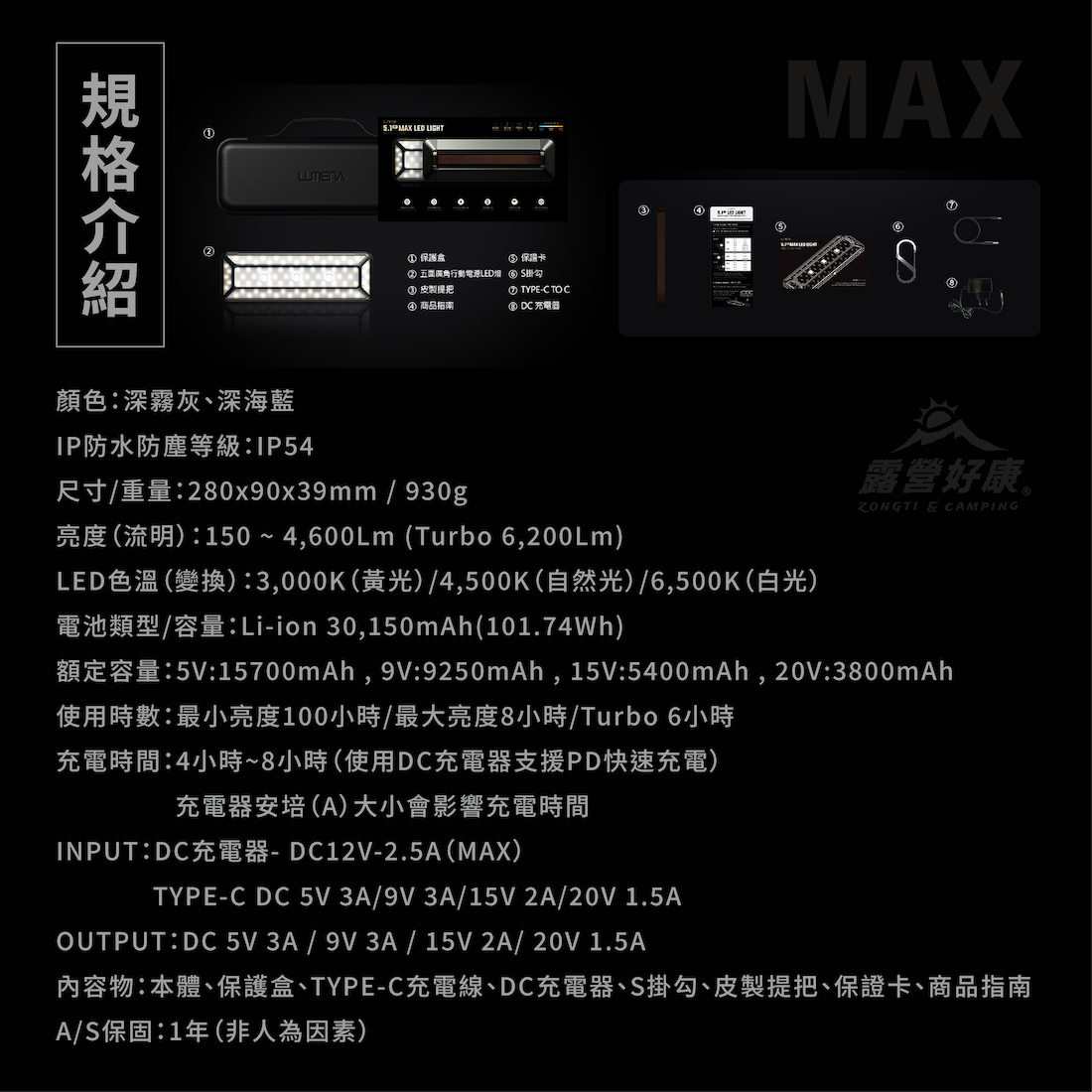 ✔大容量電池30,150mAh,最小亮度可使用100小時