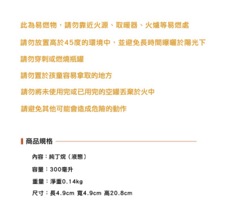 本產品為高壓易燃氣體丁烷,請謹慎操作