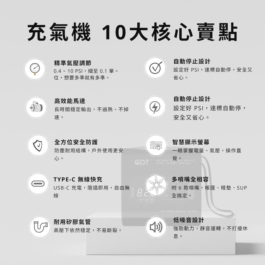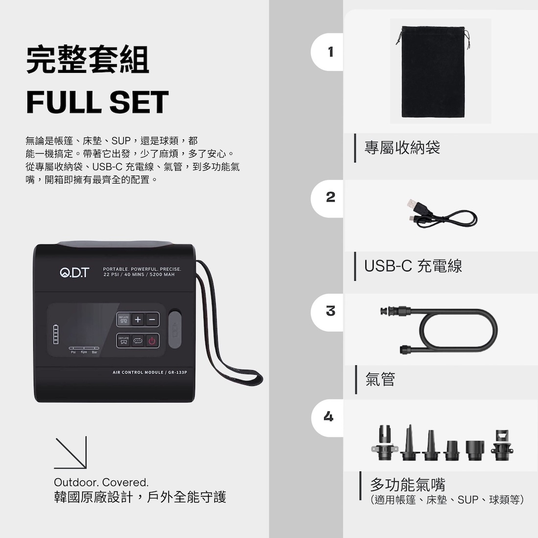 ✹全能相容:6 種氣嘴,帳篷、床墊、SUP、球類一次全包
