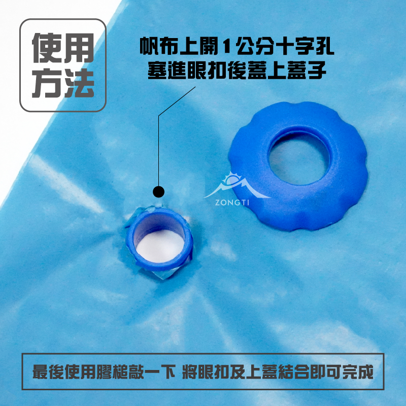 在帆布上割一個十字孔,將眼扣上下塞進十字孔裡,用膠鎚一敲,就剛成安裝