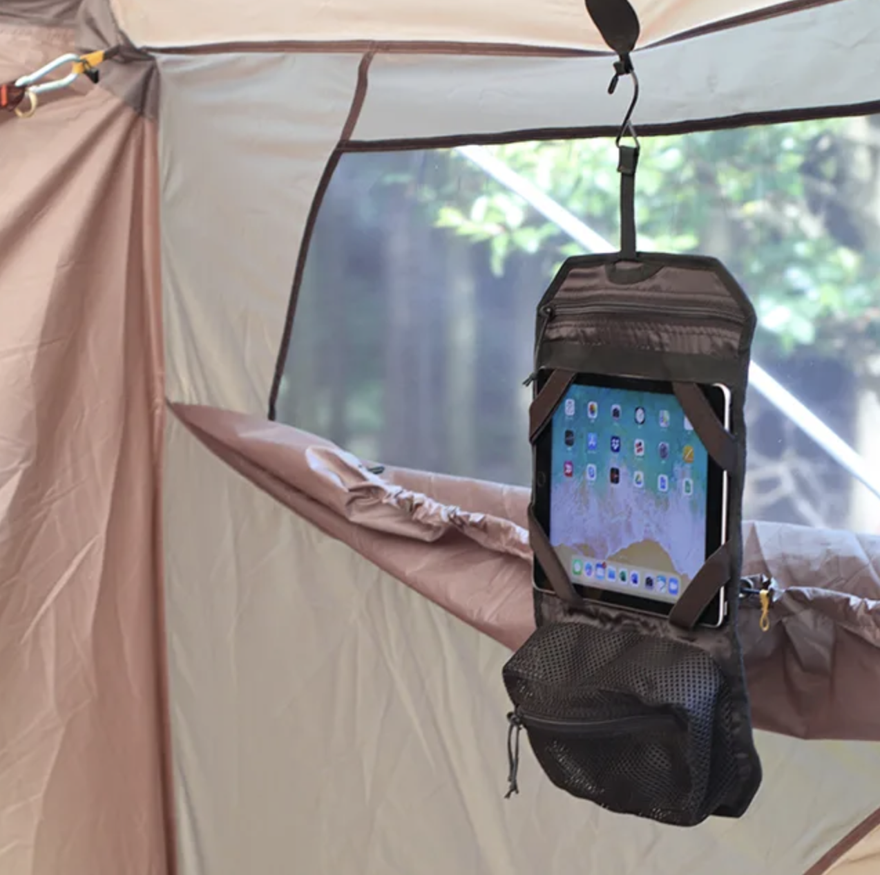 它可以掛在汽車座椅後面,可放ipad、衛生紙盒和手機等小物件。當然也適合在帳篷中使用。