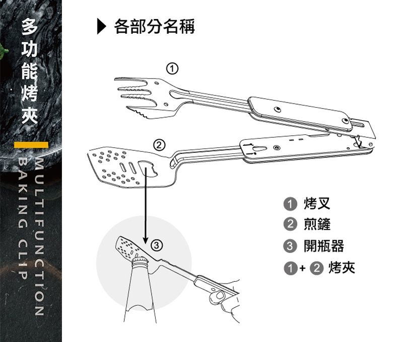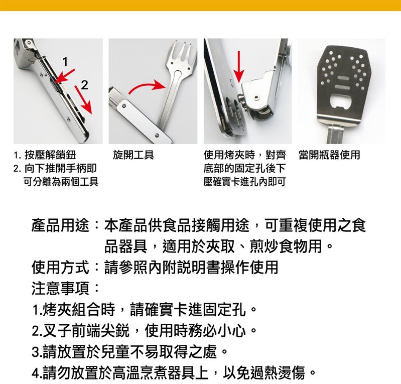 小小一把,一下變成炒菜的煎鏟、一下變成叉子、那邊要喝汽水還可以當開瓶器、一組合又變成烤肉夾,全部吃完時折一折直接丟口袋竟然就毫無存在感!!!好輕鬆簡潔喔 連收納達人都在不絕口的好物