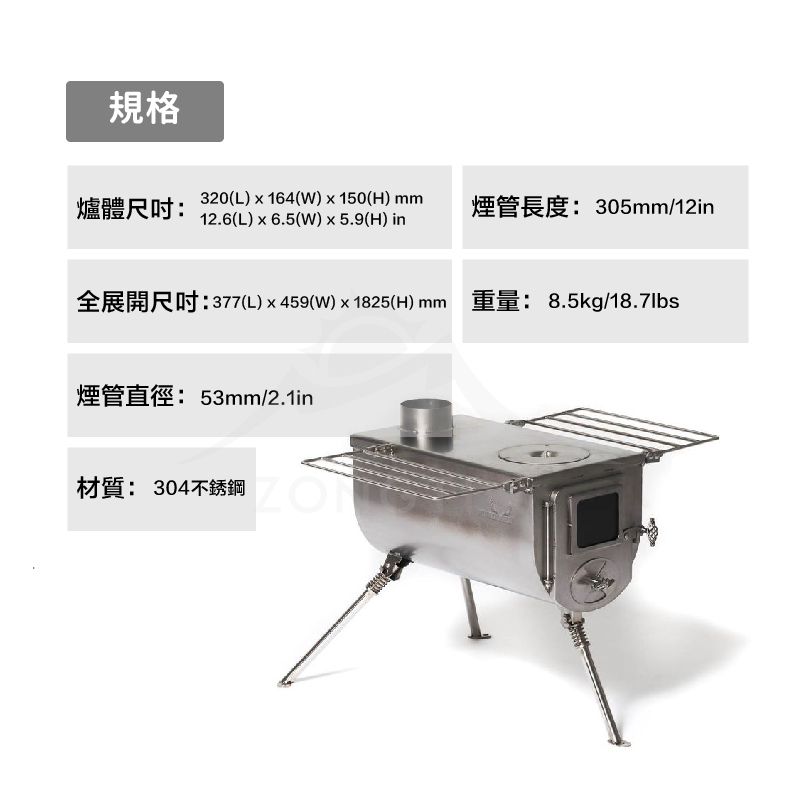 Stove Body Dimension 320(L) x 164(W) x 150(H) mm / 12.6(L) x 6.5(W) x 5.9(H) in