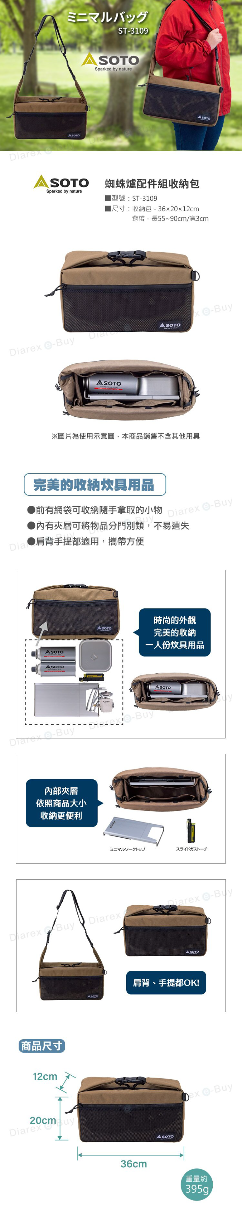 【尺寸】收納包:36×20×12cm±3%、背帶:長55~90cm/寬3cm±3%