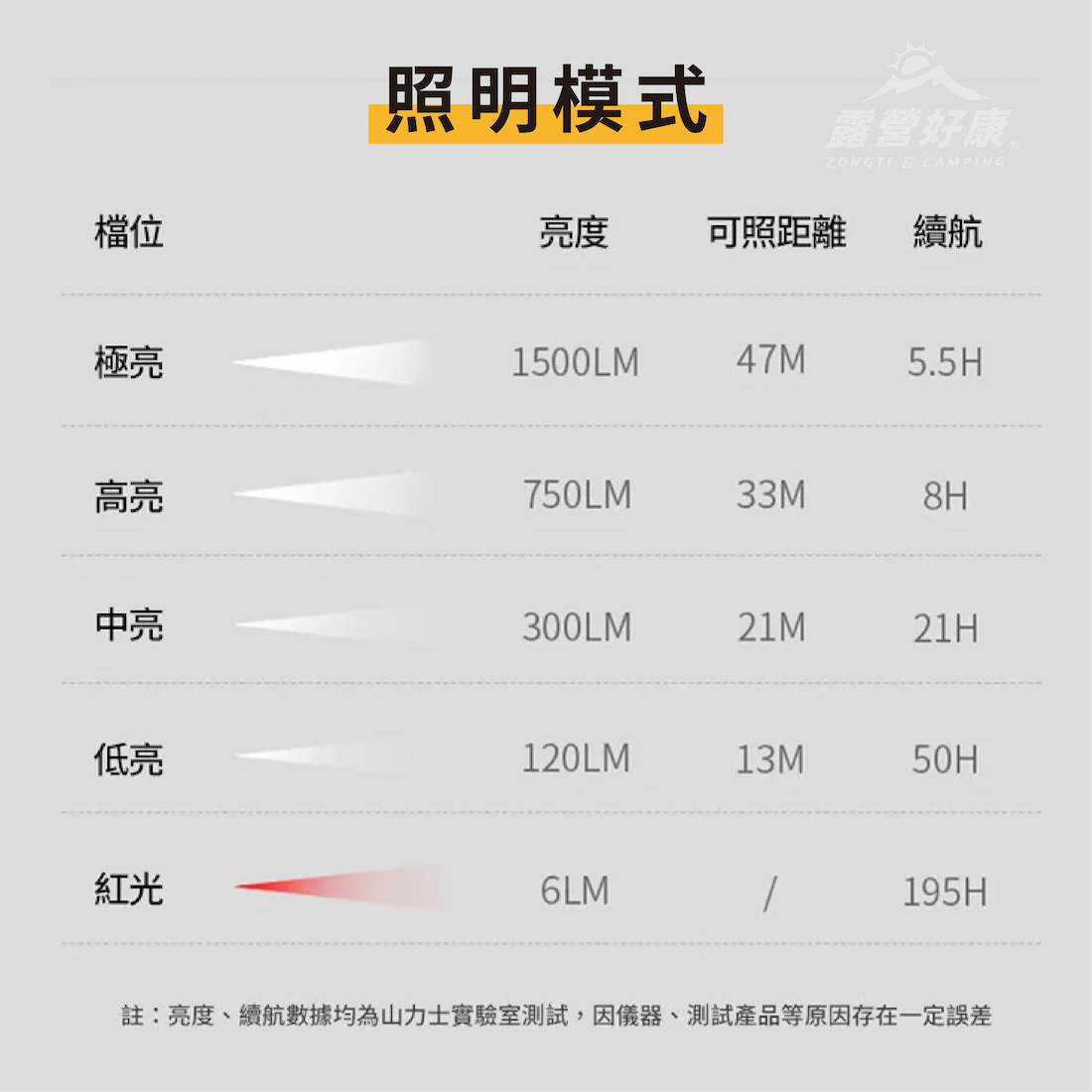 ✔可五種亮度模式:極高亮/高亮/中亮/低亮/紅光