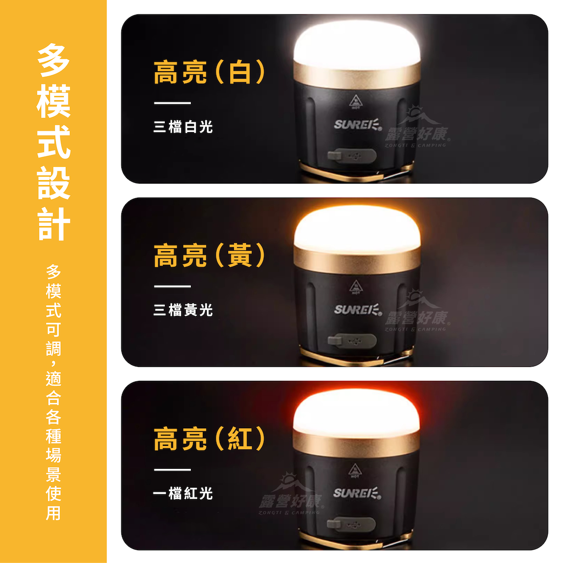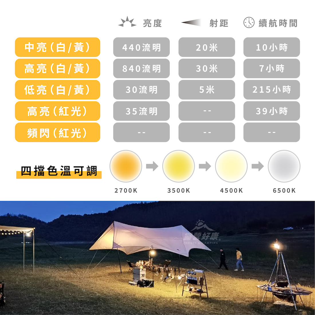 ✔三色溫變換:白光/黃光/紅光/紅光閃爍