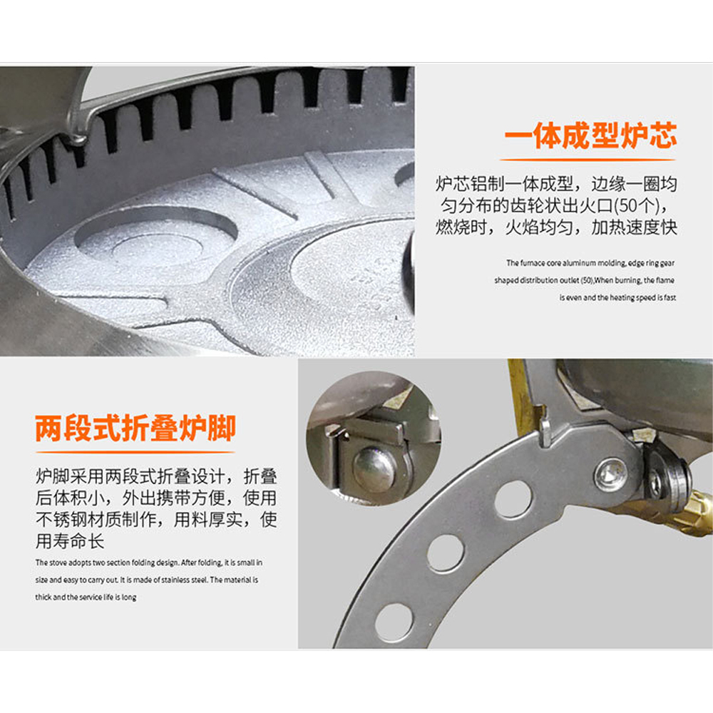 50個燃氣孔同時旋轉噴射,實現了比同級別功率的高山爐節省了不少於10%的燃氣,提高了燃燒效率,加熱速度快!下支架兩段折疊設計,更節省空間,戶外攜帶便捷!