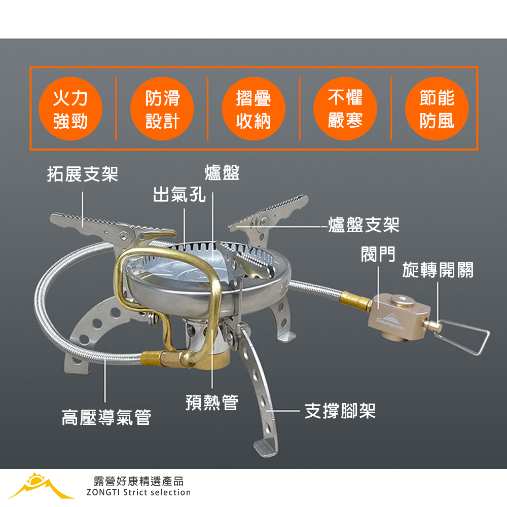 適用于戶外登山、露營、探險、穿越、徒步、騎行等多領域的專業型爐具。採用先進的鋁壓鑄工藝與優質耐高溫不銹鋼材質所搭配以及獨特的內焰式燃燒系統,並且實現無需預熱即可在零下15°的高山嚴寒環境下正常使用。