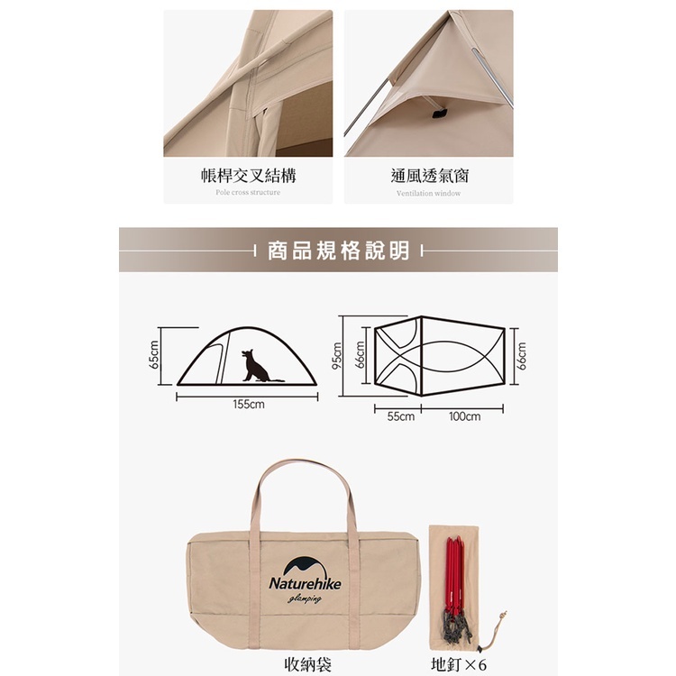 材質:●面料-混紡棉布(聚酯纖維+棉布)●帳底-PVC●帳桿-鋁合金●地釘-鋁合金