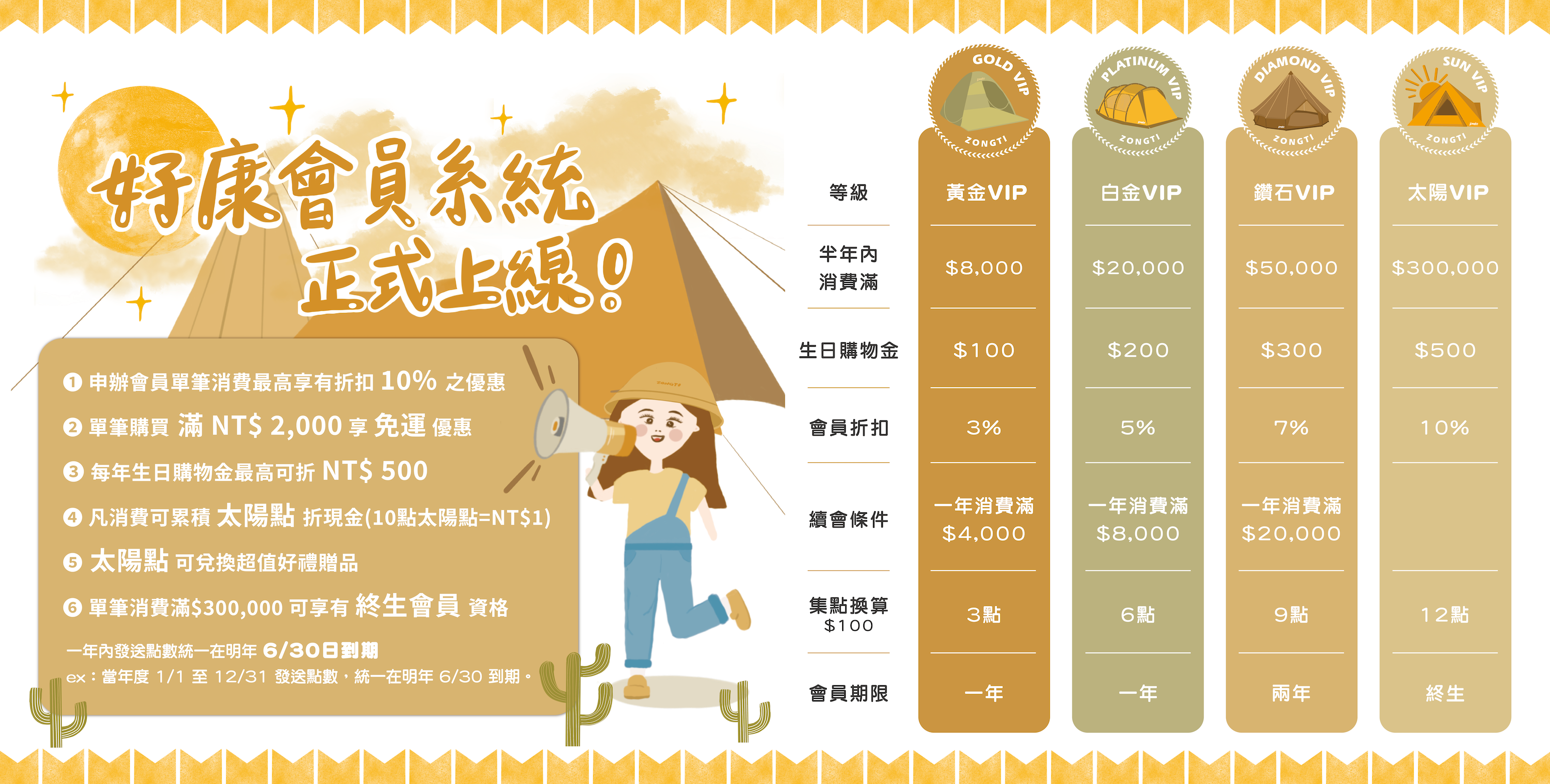 加入 ZONGTI 露營好康官網會員,立即享有以下權益!