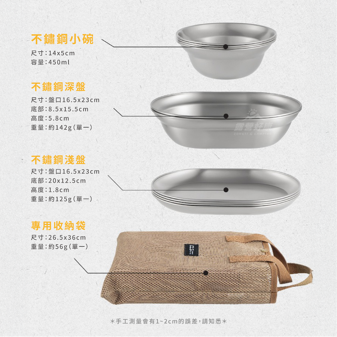 📍內容物:不鏽鋼小碗x4、不鏽鋼深盤x2、不鏽鋼淺盤x2、專用收納袋x1