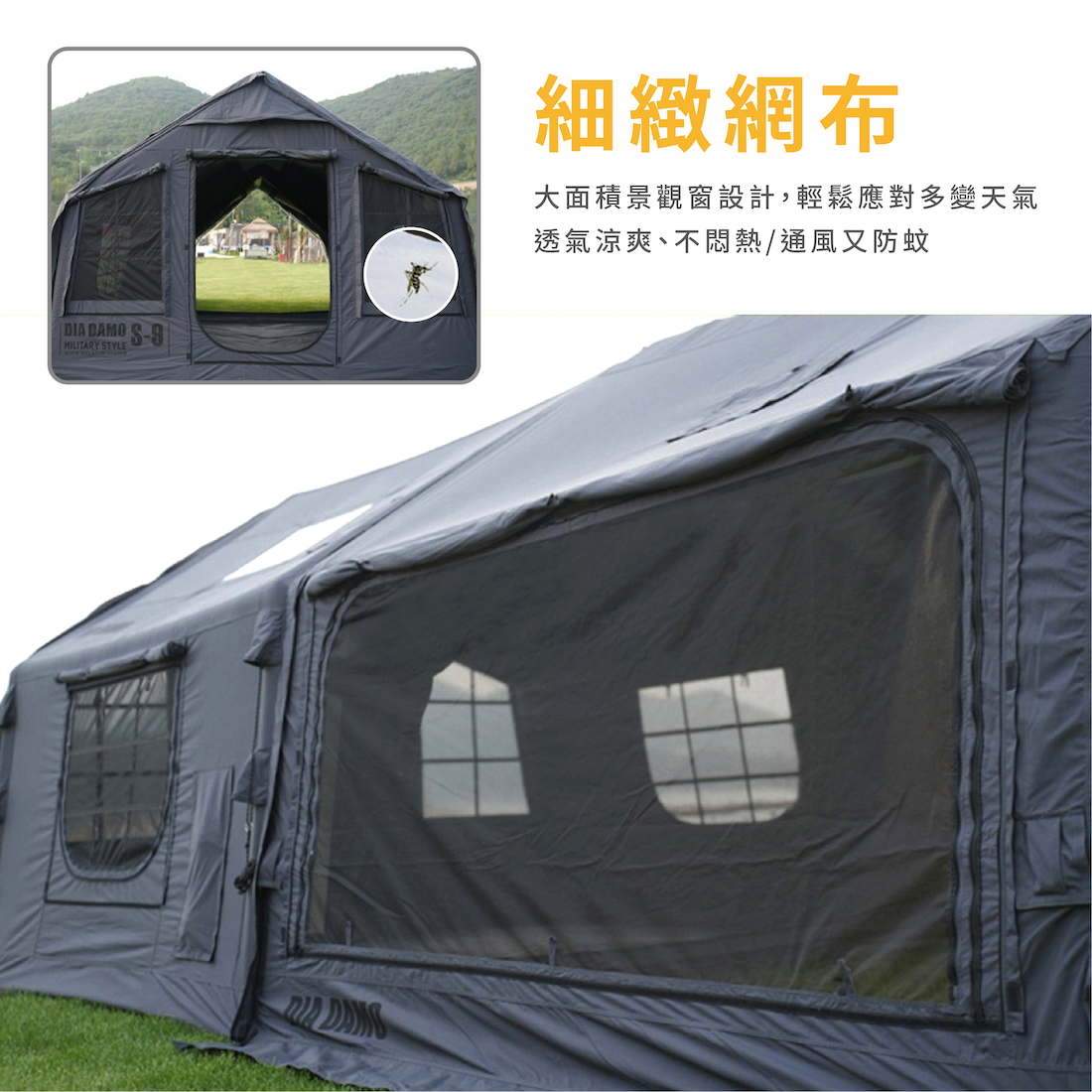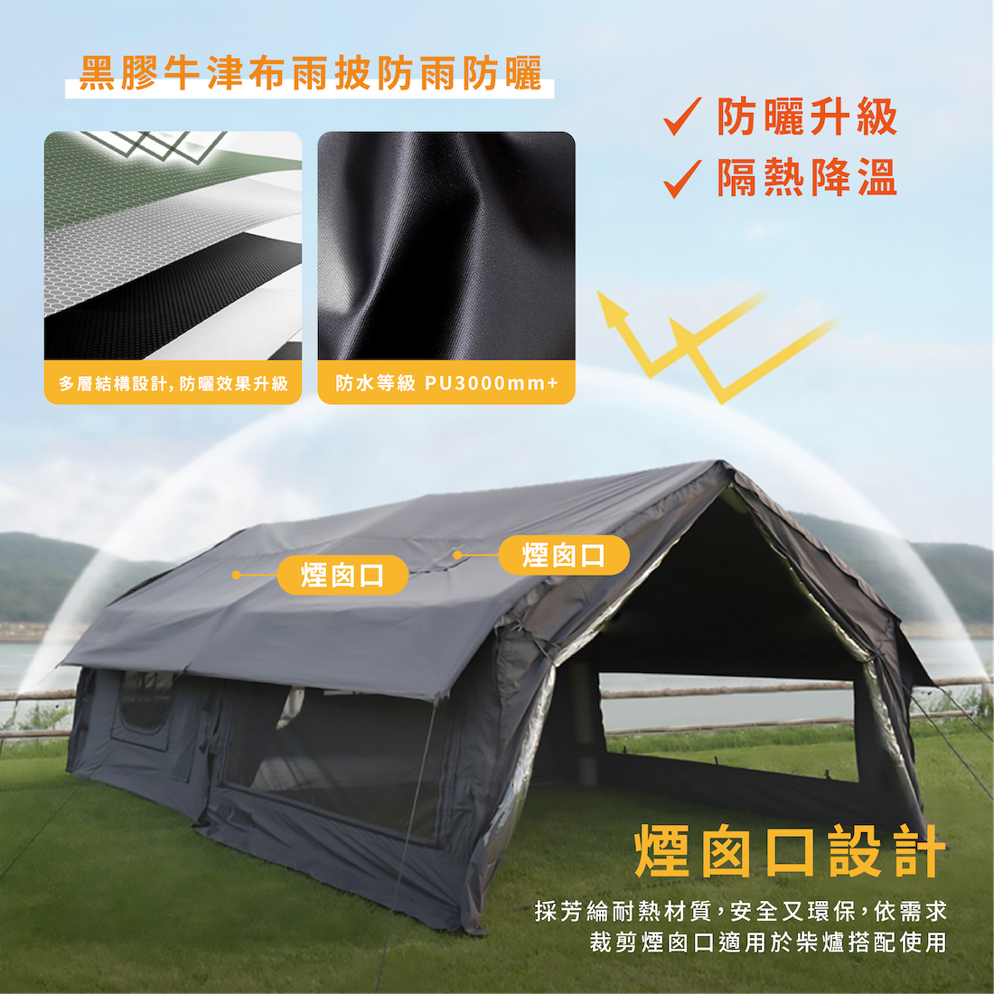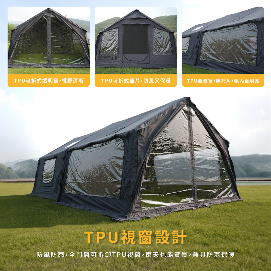 ✔優秀開放感設計:多扇門窗、煙囪孔、冷氣口、電線口、暖風口等,有助於帳內通風順暢,外部放下可遮擋雨水,保護隱私;頂部天窗展現出色開放感