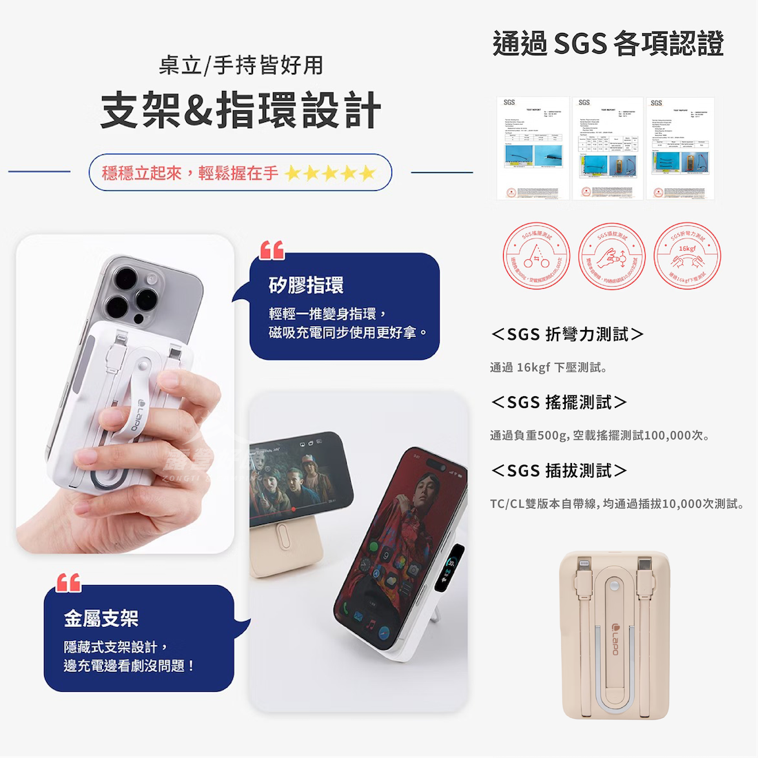・隱藏式金屬支架,無線充電時可直接站立