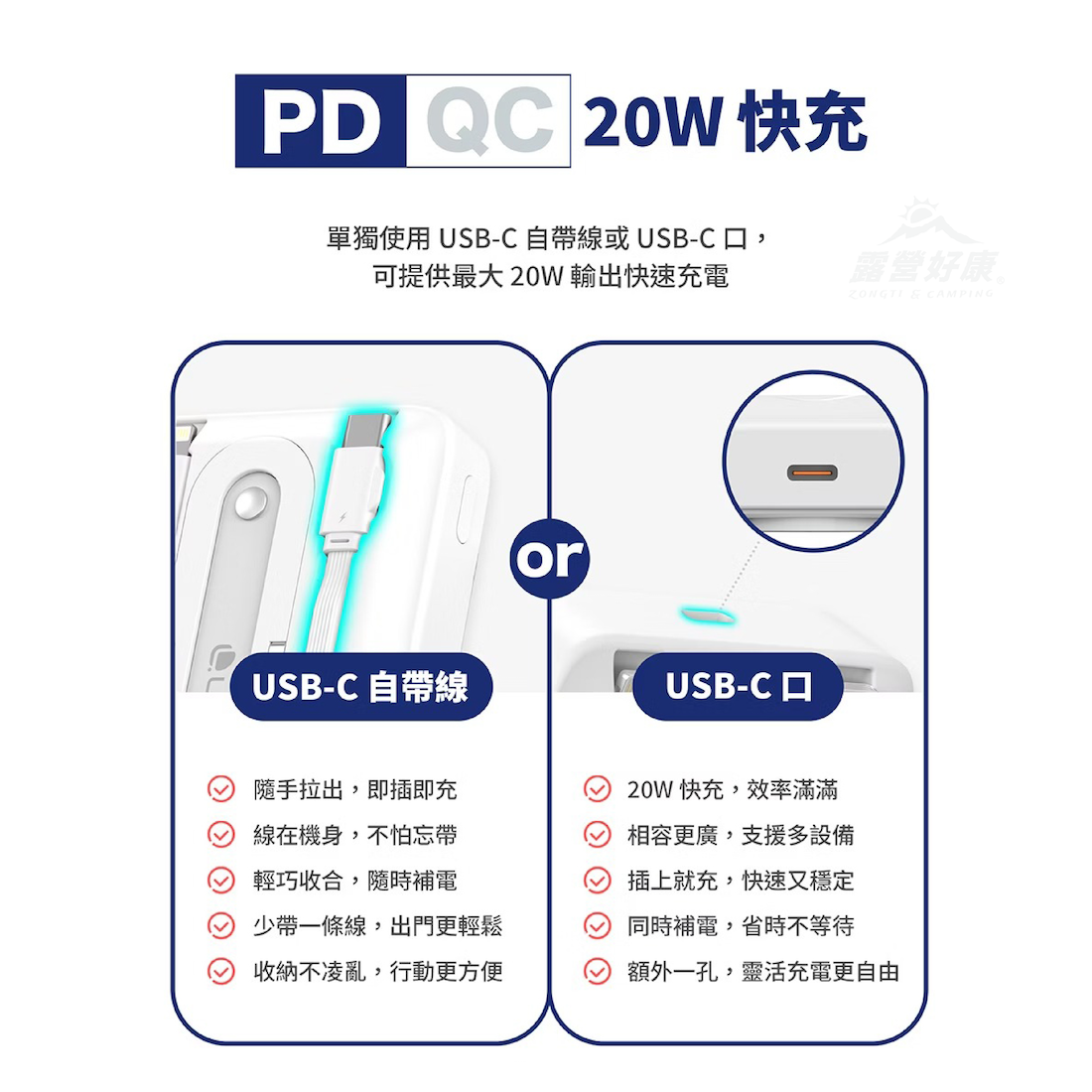 ・USB-C口支援QC/PD協議,單獨使用最高20W快速充電