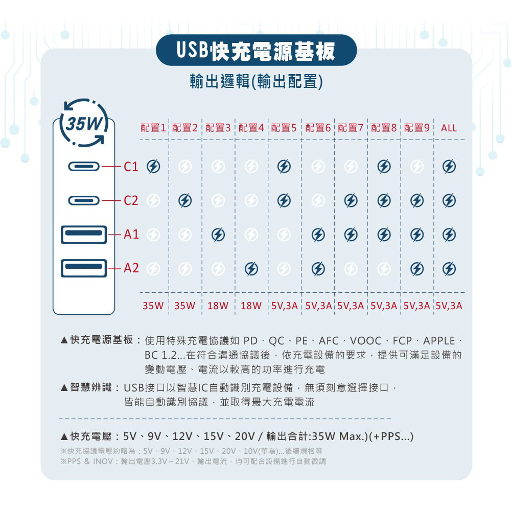 ✔具智慧辨識功能,可支援快充,內部 Smart IC 能自動偵測每孔裝置所需的電流