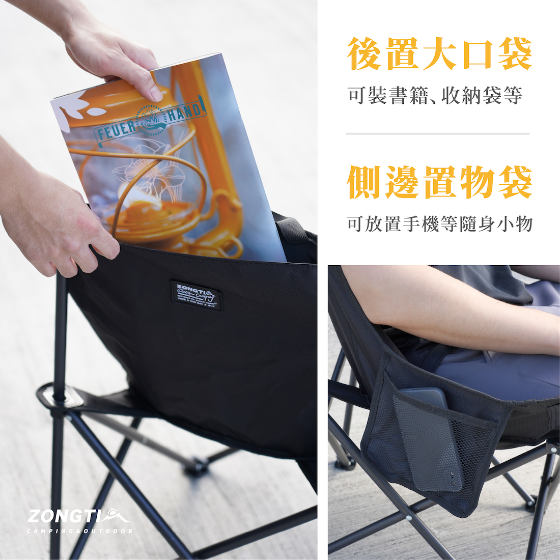 ✔側邊置物袋設計,可放置手機及小物